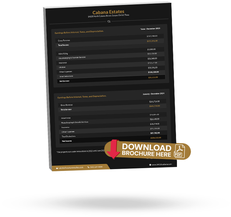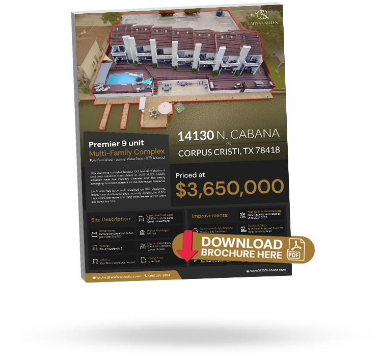 Cabana Suites is in a prime location on the Commodores canal. We have a brand new bridge and no dead ends for great water flow & oxygenation. The property has quick access off the JFK causeway to the local hospitals and La Palmera Mall. The greater Corpus Christi community is experiencing steady development and revitalization across several key sectors, including residential, commercial & tourism infrastructure.