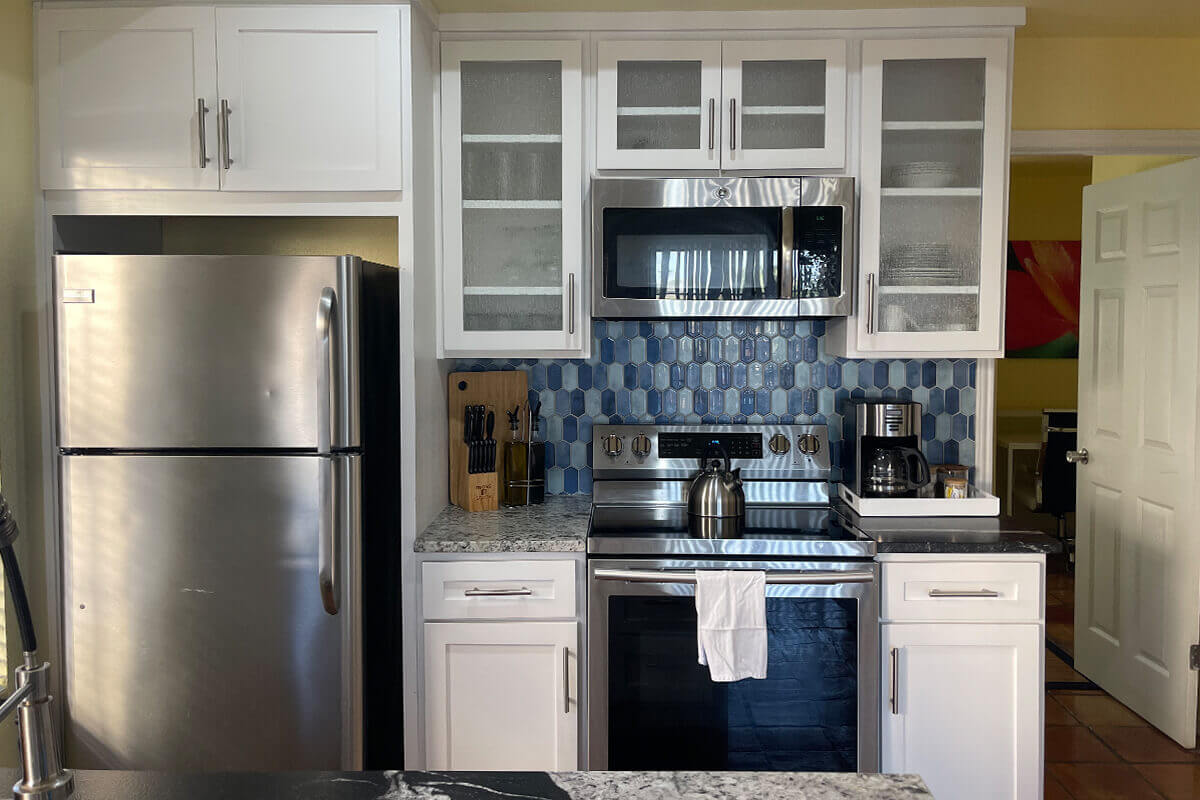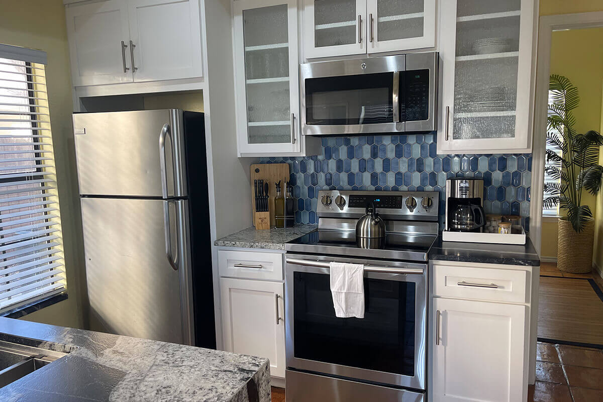 Kitchen: Fully renovated in 2023, this kitchen features sleek white swiss cabinets, an electric stove, toaster oven, and leathered granite countertop paired with a colorful backsplash. The breakfast bar comfortably seats three. The kitchen is fully equipped and includes: