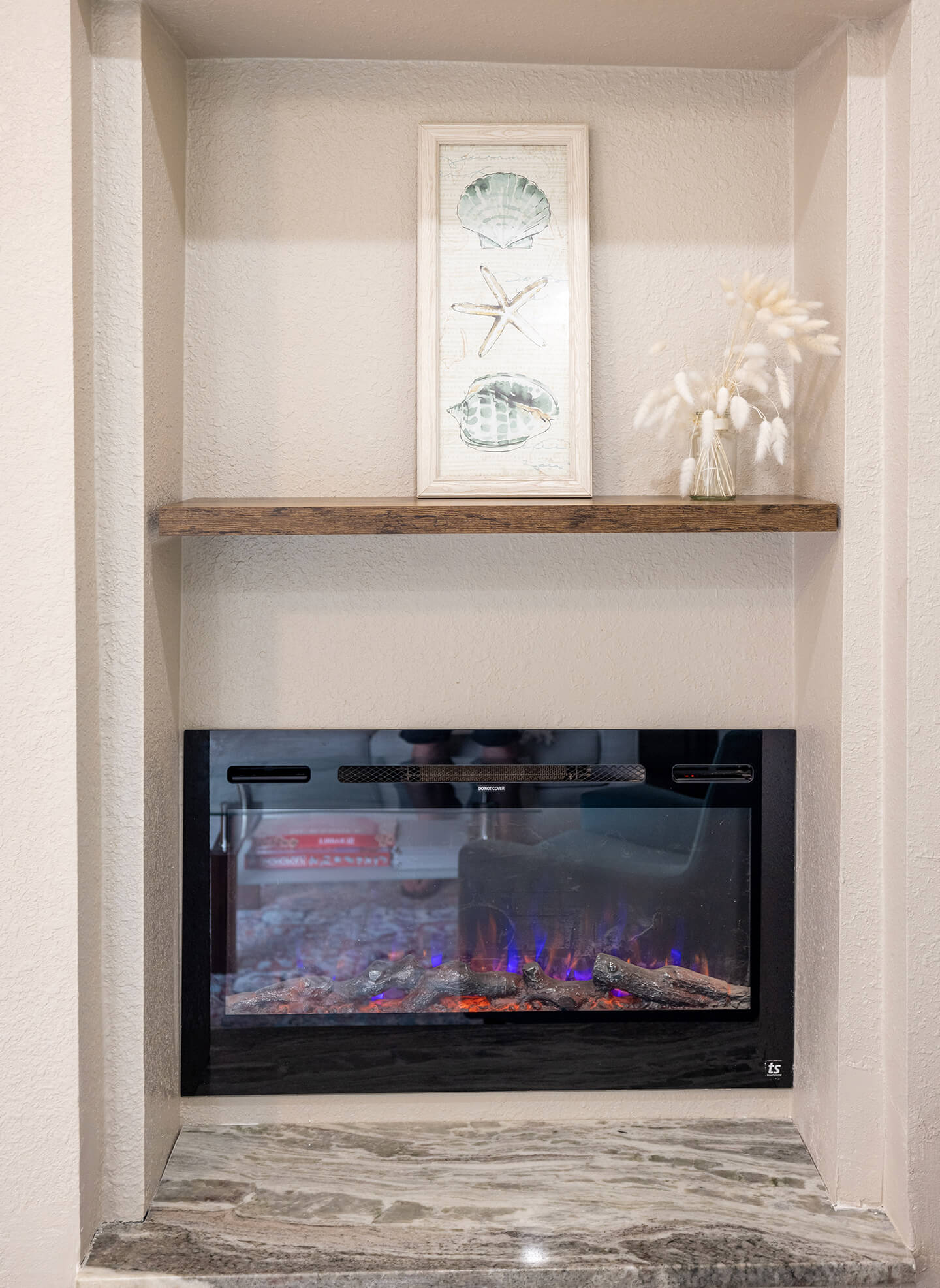 Living Room: Open living room with 72 inch sleeper couch and complementary sitting chair and poof. 4 person dining set with beach themed place mats. Monopoly / Scrabble and a poker card set are included in the coffee table. Electric fireplace with color changing designs and heating element. LED candles throughout.